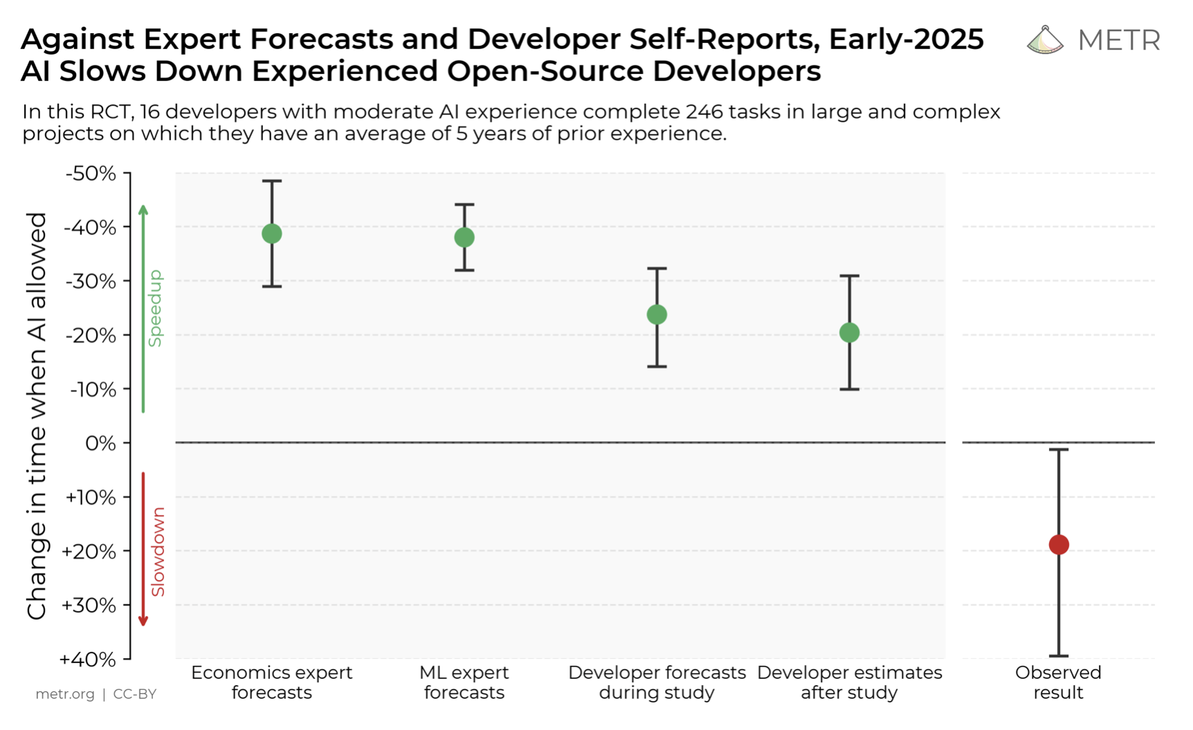 All das erklärt ein Stück weit die Skepsis und den Vertrauensverlust, der in den Umfragen so deutlich zum Ausdruck kommt. Denn wenn der Code, den die KI abliefert, so viel nachträgliche Arbeit verursacht, wie viel bleibt von der erhofften Zeitersparnis noch übrig? Eine Antwort darauf versucht eine Studie von METR zu liefern. Hierfür mussten 16 Entwickler 246 Tasks in großen und kleinen Projekten durchführen, in welchen sie jeweils durchschnittlich fünf Jahre Erfahrung hatten. Fazit: Die Nutzung von KI hat ihre Arbeit nicht beschleunigt, sondern um 19 Prozent verlangsamt.
